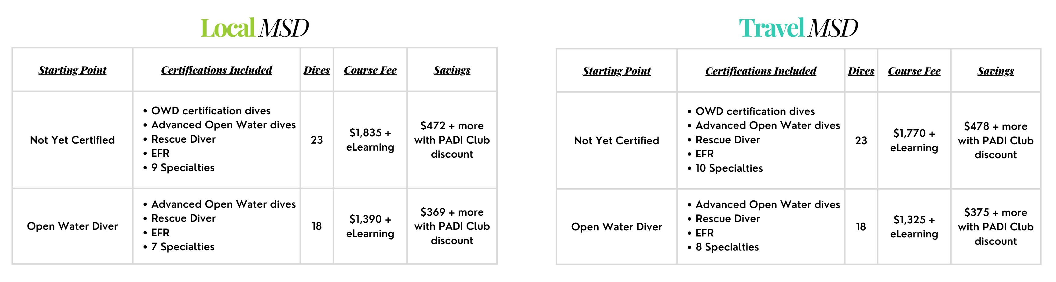 Local MSD focuses on Mid-Atlantic skills — drysuits, wreck diving, search & recovery — ideal if you dive locally or are considering going pro. Travel MSD is built for warm-water adventures with specialties like underwater photography, fish ID, and shark conservation.